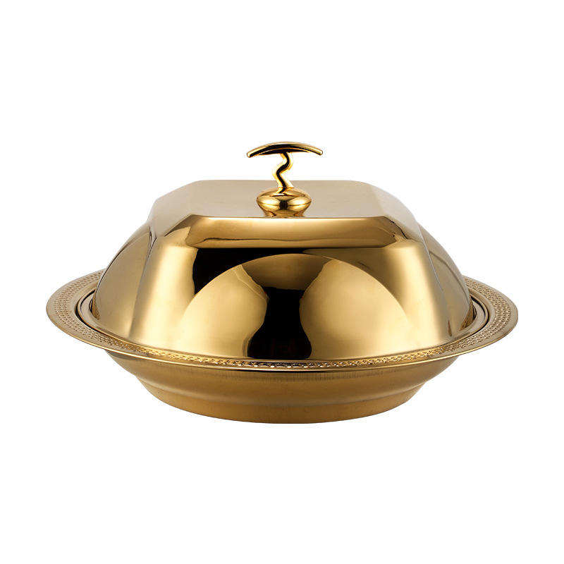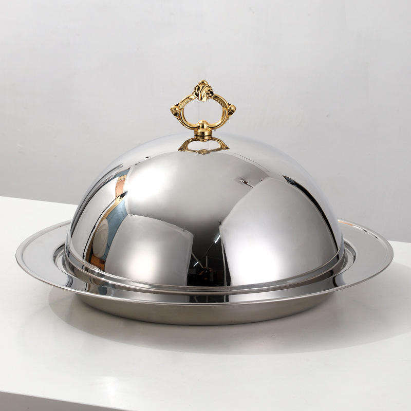 Ensemble d'assiettes à steak en aluminium écologique avec couvercle, plat de service finition miroir, couvercle haut avec incrustation dorée, forme de luxe léger, pour snacks d'hôtel