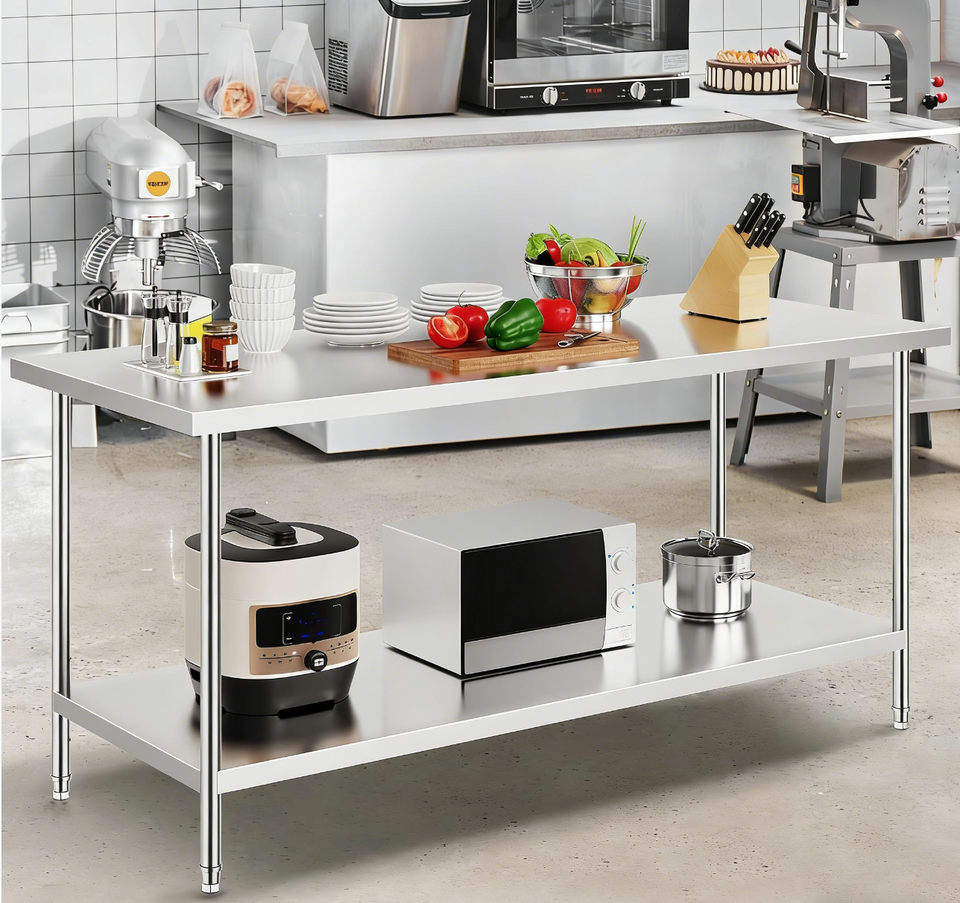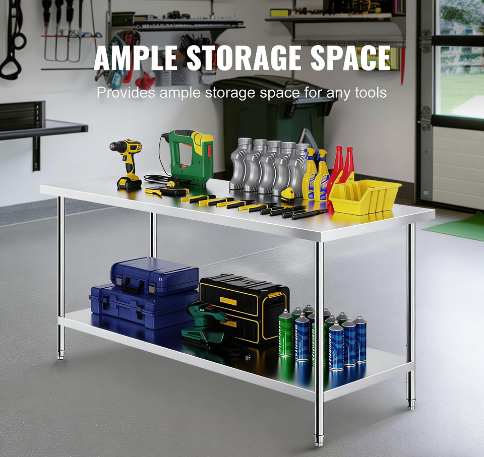 Table de travail en acier inoxydable robuste à 2 niveaux, poste de travail commercial pour cuisine, garage, restaurant, cour arrière