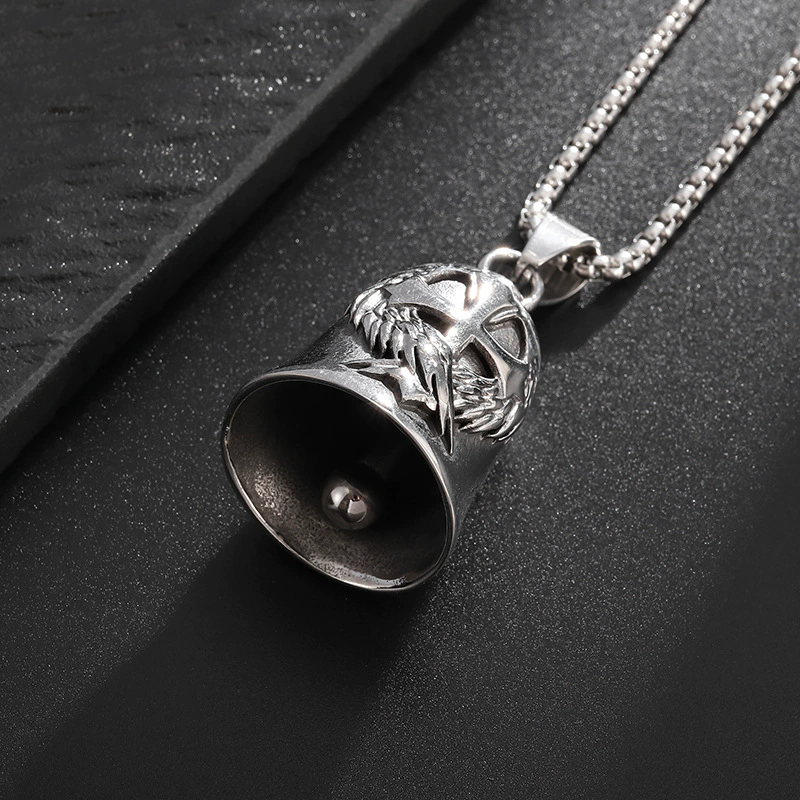 Stainless Steel Tarnish Free Punk Wings Cross Motorcycle Bell Pendant Necklace Guardian Biker Gremlin Bell for Men Women