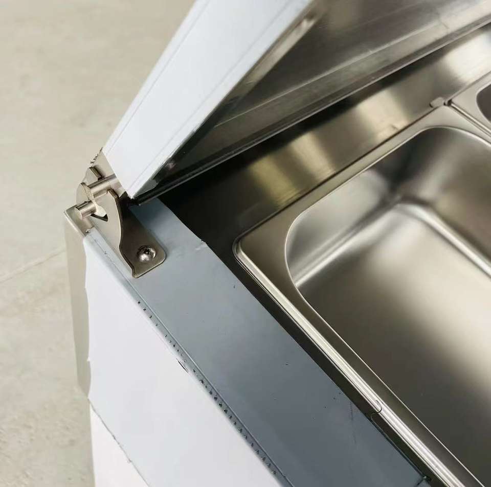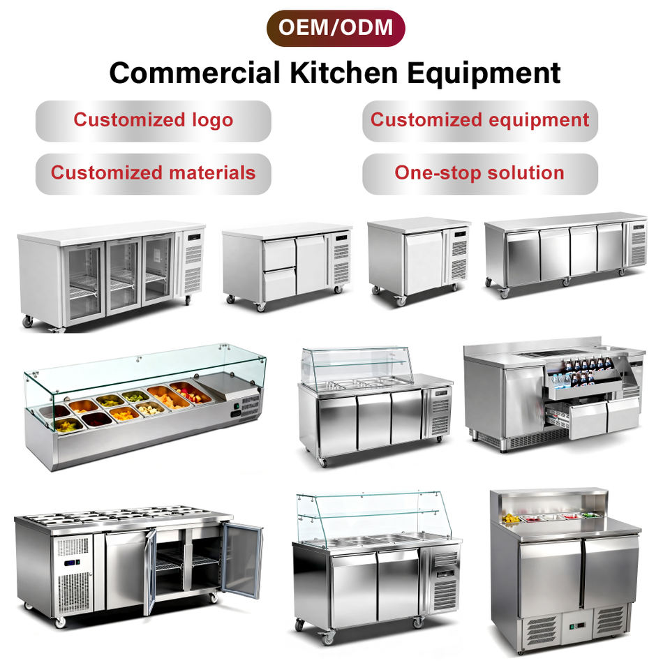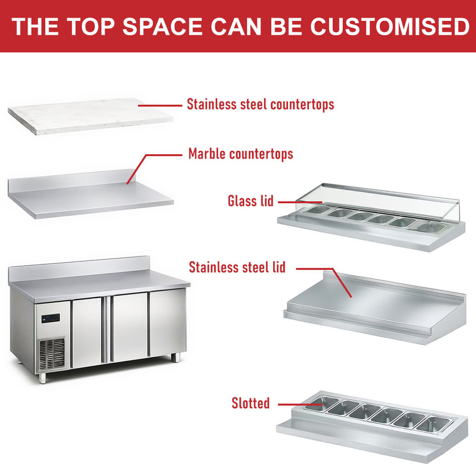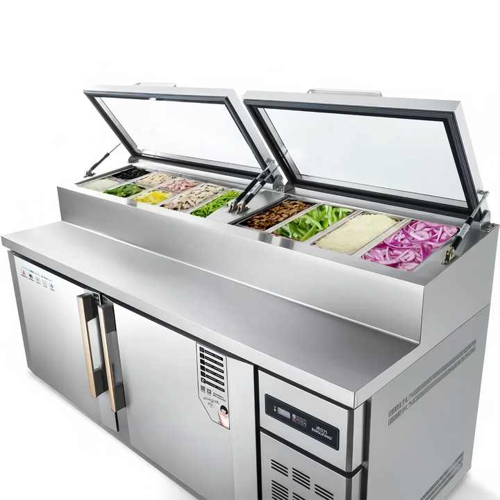 Table de travail en acier inoxydable, comptoir réfrigérant, réfrigérateur commercial, bar à salades, pizza, préparation de pizzas et de salades réfrigérées