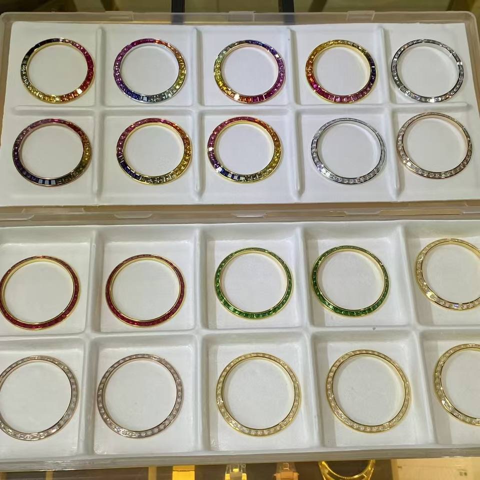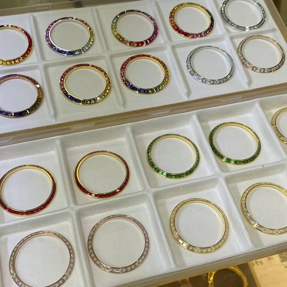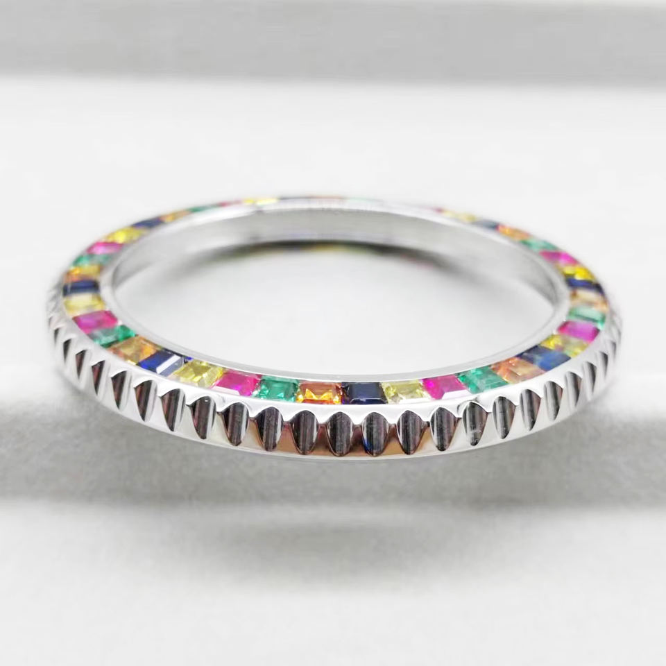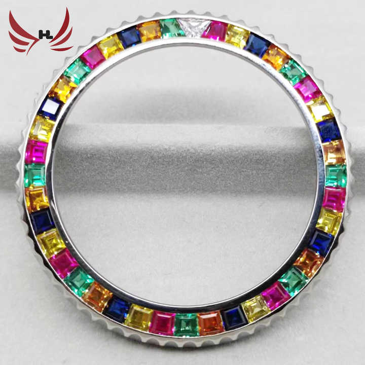 Lunette en acier inoxydable avec des pierres d'émeraude synthétiques remplaçant les pierres d'origine de la montre Rolex GMT Master.