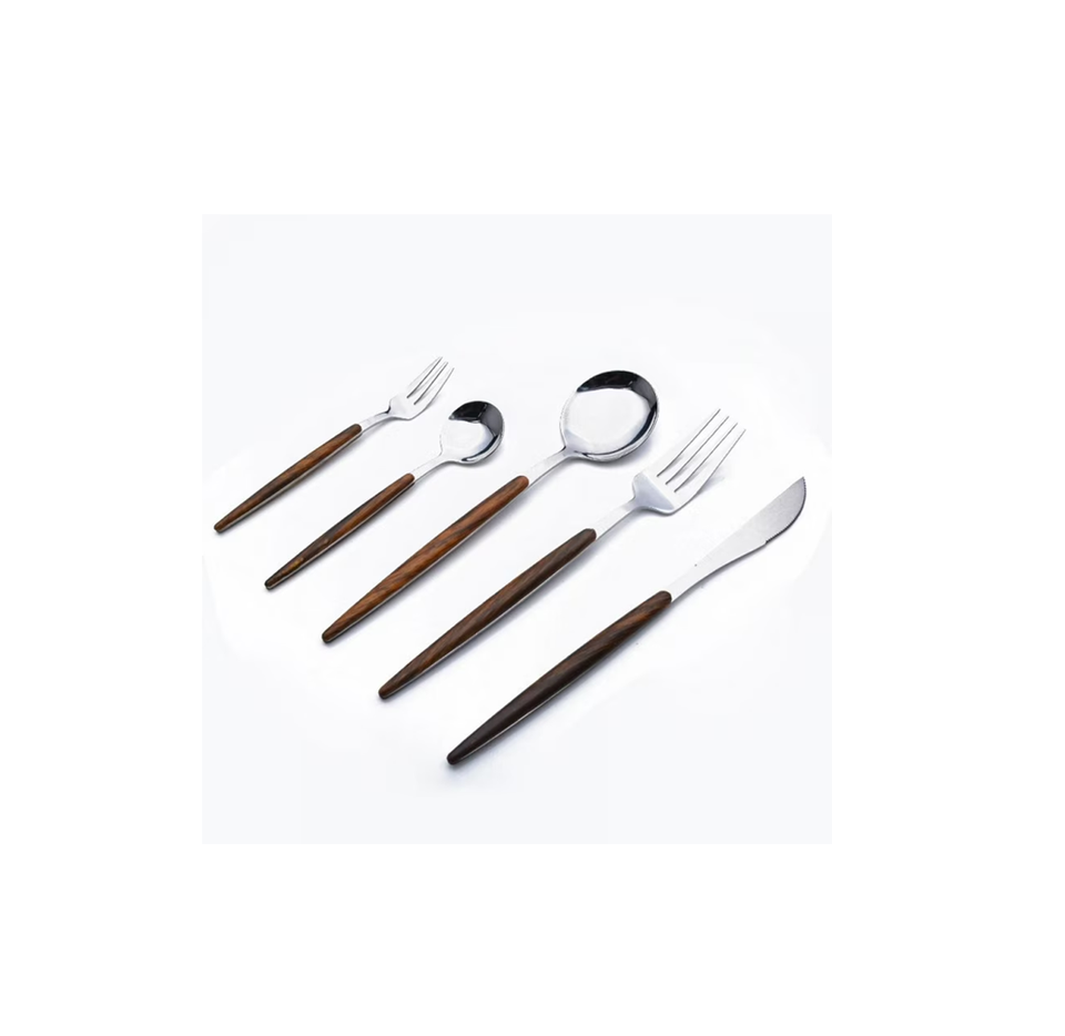 Fourchette en acier inoxydable cuillère fourchette ensemble dîner couteau couverts miroir couleur or couverts argenterie manche en bois