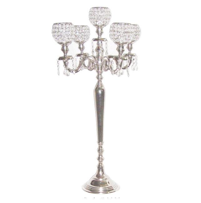 Candélabre à 5 bras en métal et perles de cristal, finition argentée, qualité supérieure, support de bougies chauffe-plat décoratif fait main pour mariage