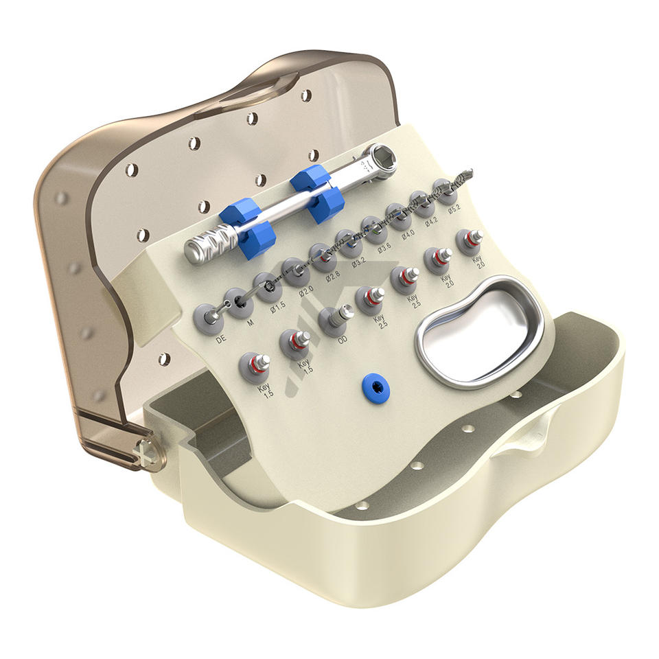 Boîte de kit chirurgical standard avec connecteurs hexagonaux internes, forets, tournevis et cliquet dynamométrique