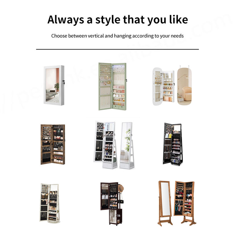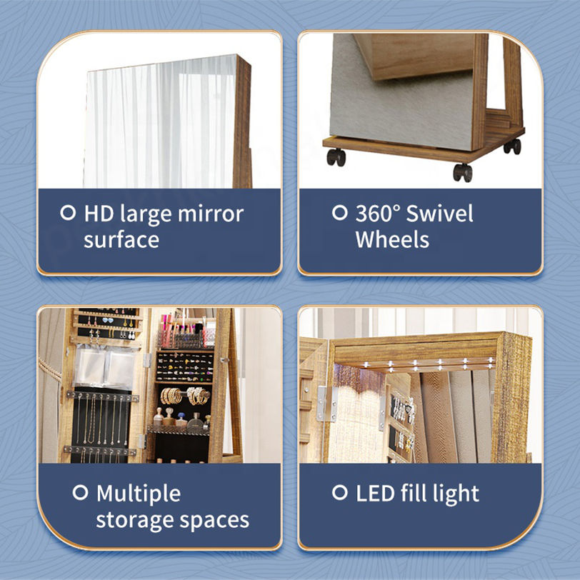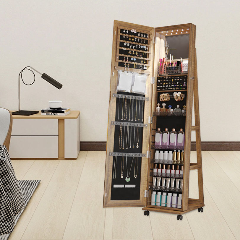 Armoire de rangement de bijoux debout miroir rotatif verrouillable avec 4 roues