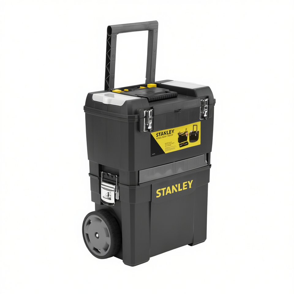 Centre de travail mobile Stanley 2 en 1 avec boîte à outils, roues et poignée pour le rangement en atelier