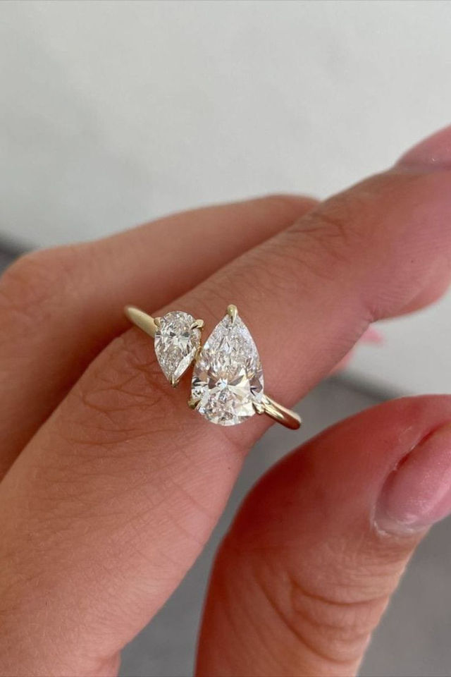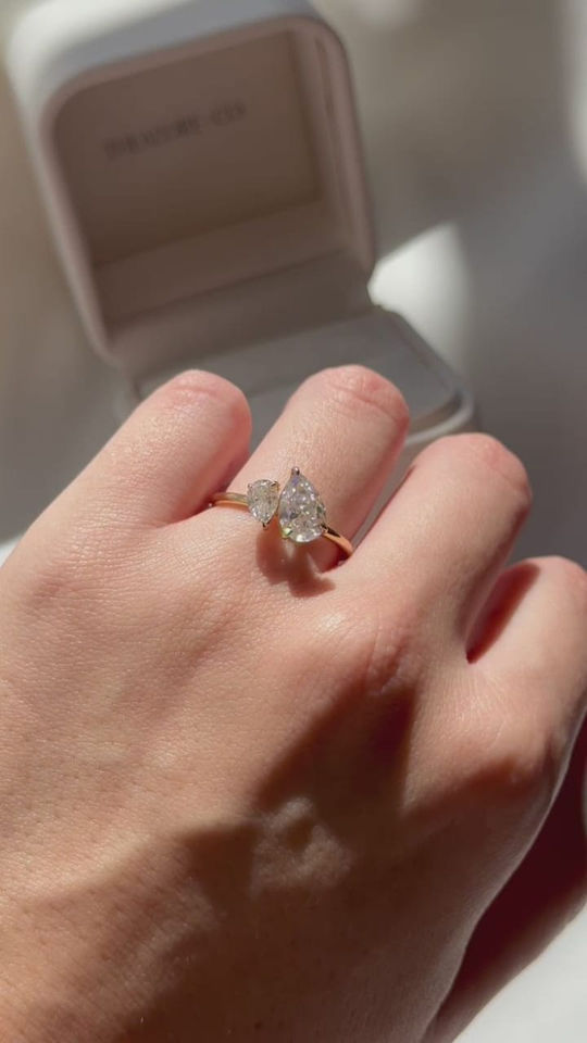 Bague de fiançailles en or véritable massif de poussière d'étoile, diamants taille poire naturels et de laboratoire, design élégant à deux pierres, étincelle intemporelle