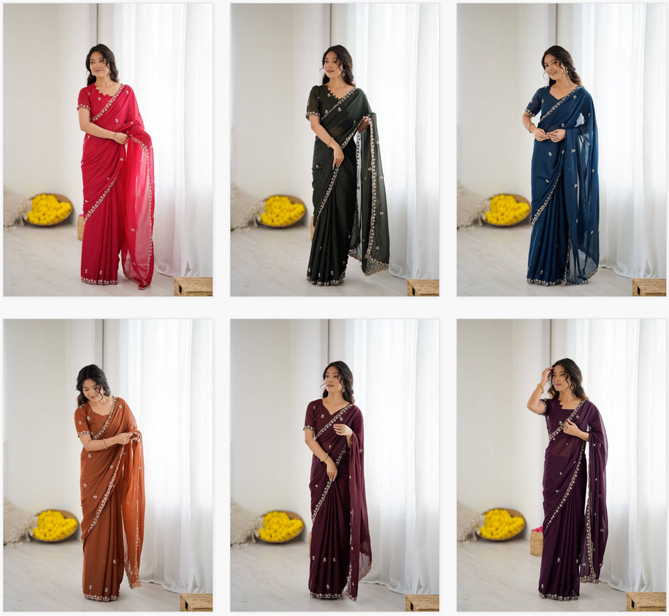Collection de saris en soie Georgette Star avec broderies fantaisie, catalogue complet disponible au prix de gros, soie Georgette Star lourde.