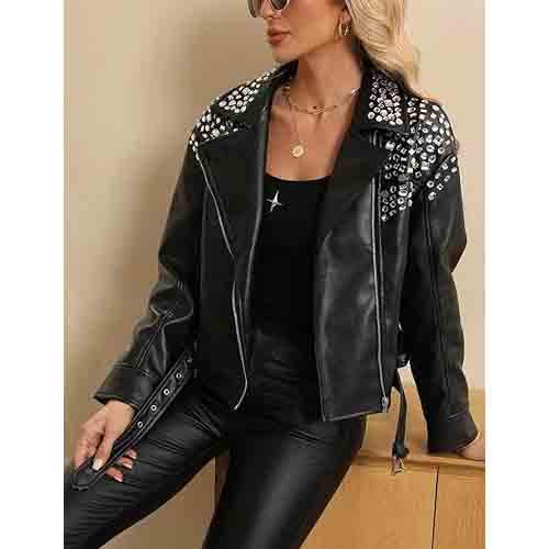Veste en cuir de motard cloutée par étoiles pour femmes Real Napa Soft Black Biker Leather Jacket for Street wear