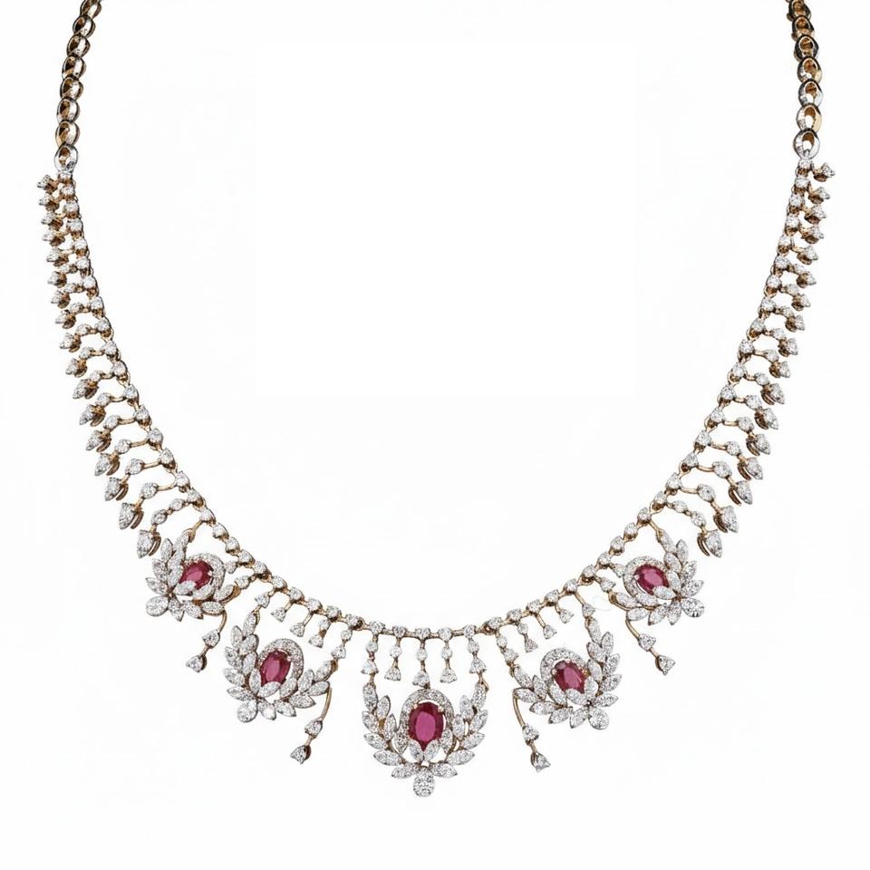 Ensemble de collier en rubis haut de gamme avec diamants étincelants en or jaune, bijoux fins faits à la main pour les événements spéciaux
