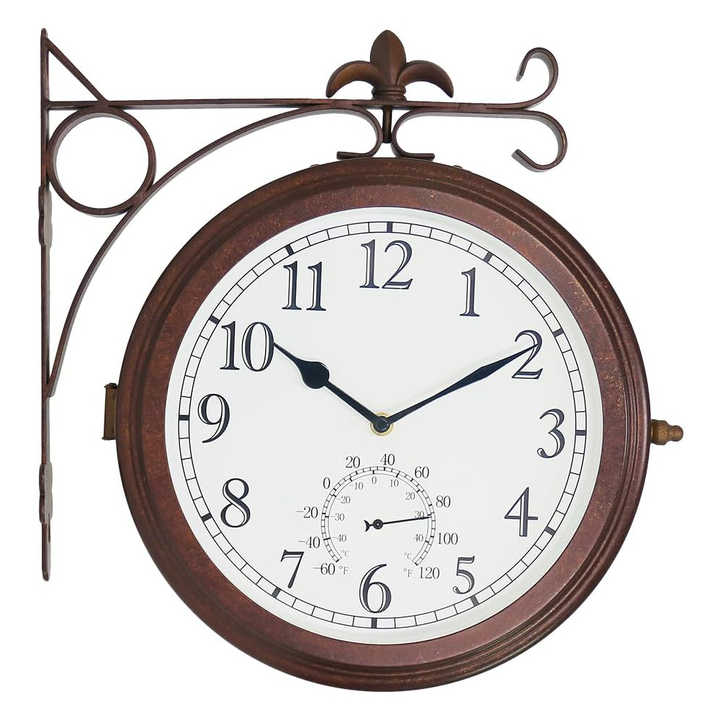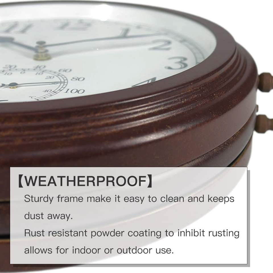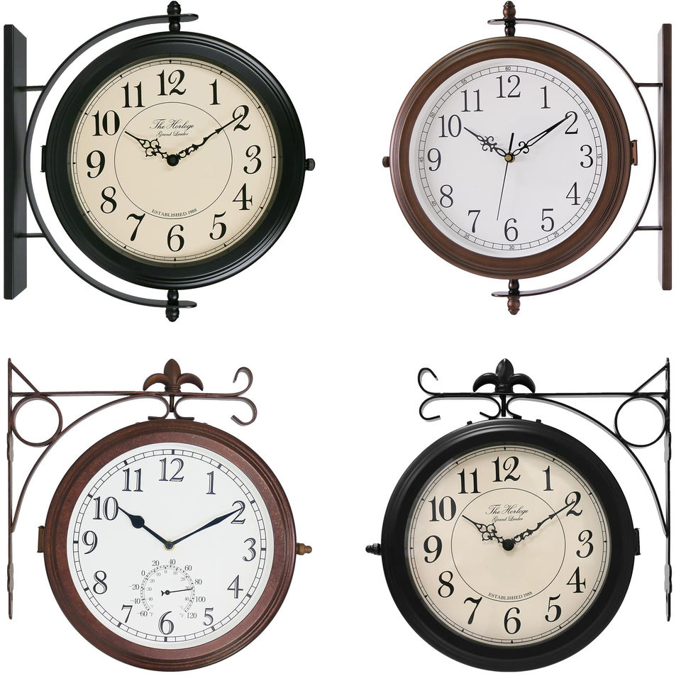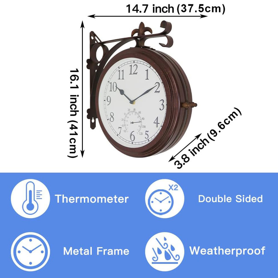 Horloge murale en métal à quartz double face de style station avec thermomètre, grand cadran, pour utilisation intérieure et extérieure