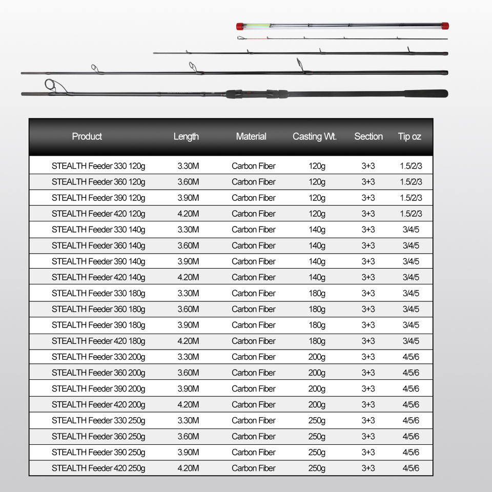 Canne à pêche Stealth Feeder 3,3 m 120 g en fibre de carbone avec guides anti-emmêlement et pointe haute puissance pour la pêche à la carpe et au barbel en rivière.
