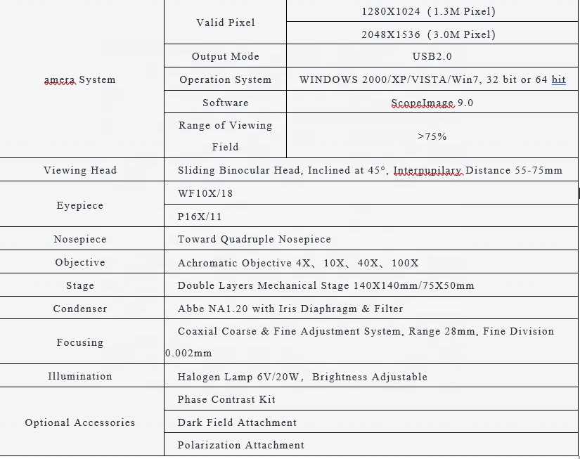 Tête de visionnement:Tête binoculaire coulissante, inclinée à 45 °, distance 55-75mm