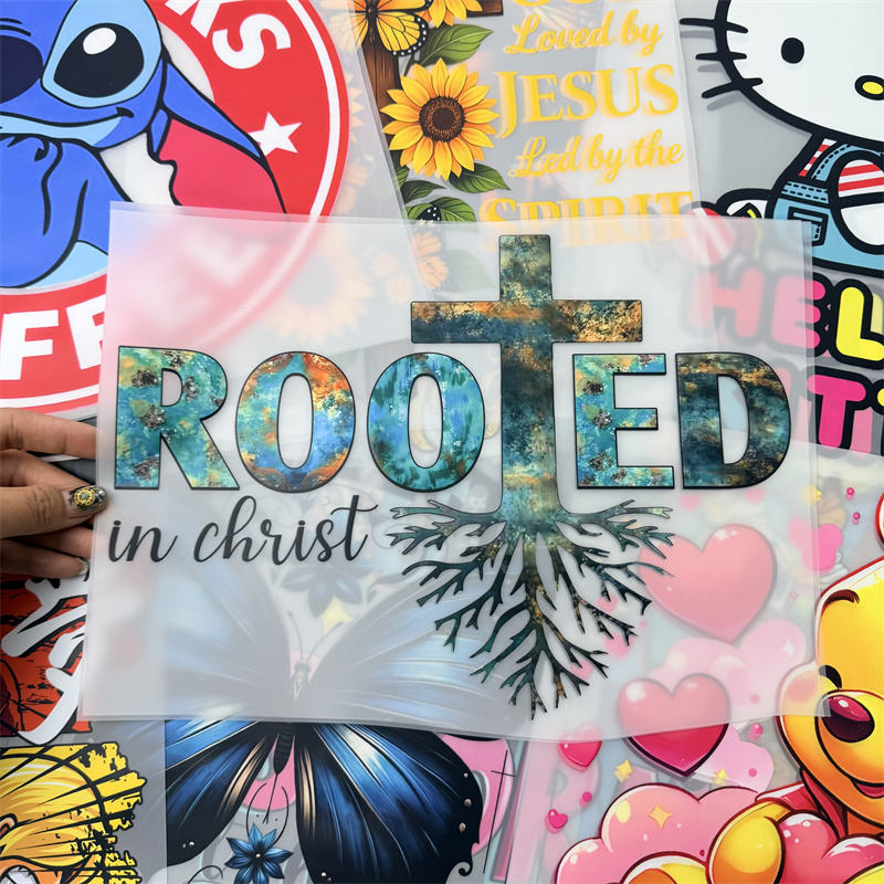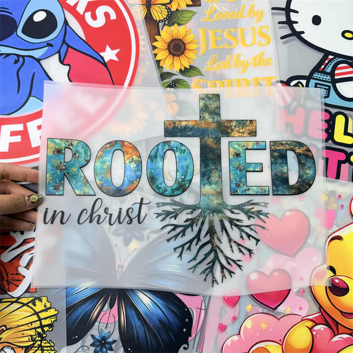 Autocollants DTF « Enracinés dans le Christ » – Motif Croix et Racines pour Vêtements de Foi Chrétienne (Vente en Gros)