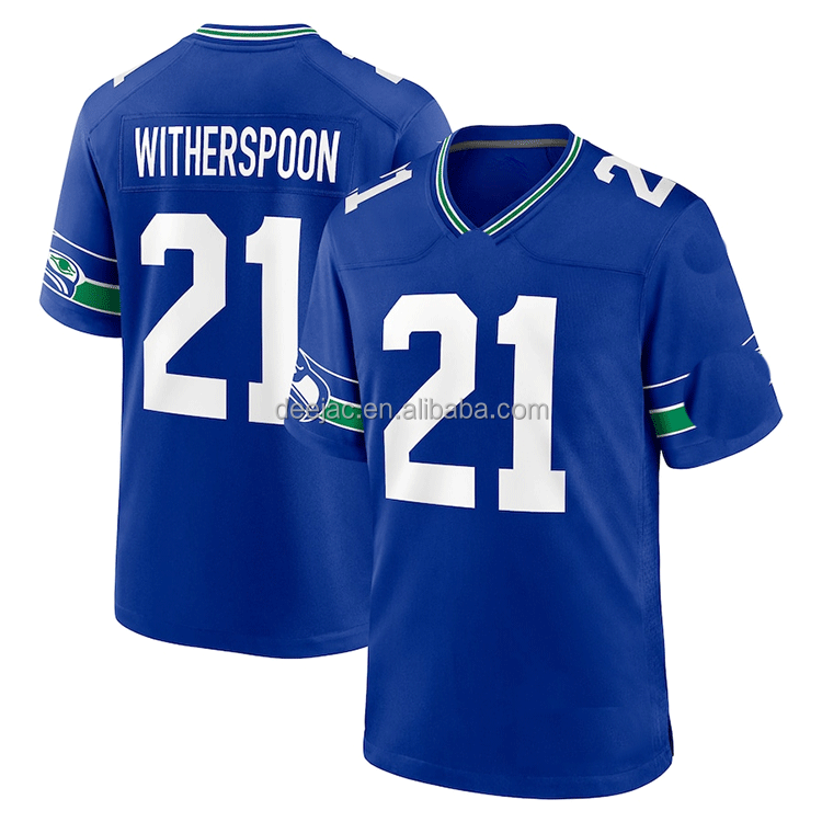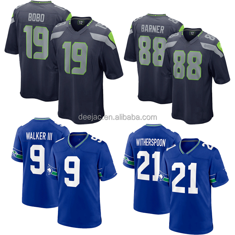 Maillots de football américain rétro cousus, porter le numéro 21 Devon Witherspoon, le numéro 9 Kenneth Walker III, le numéro 88 -Barner, le numéro 19 Jake Bobo