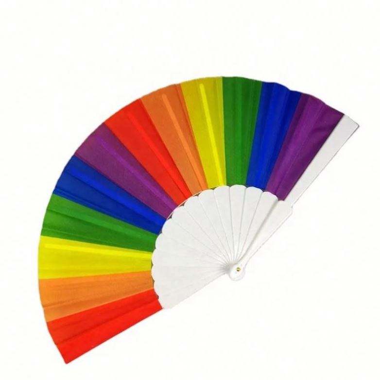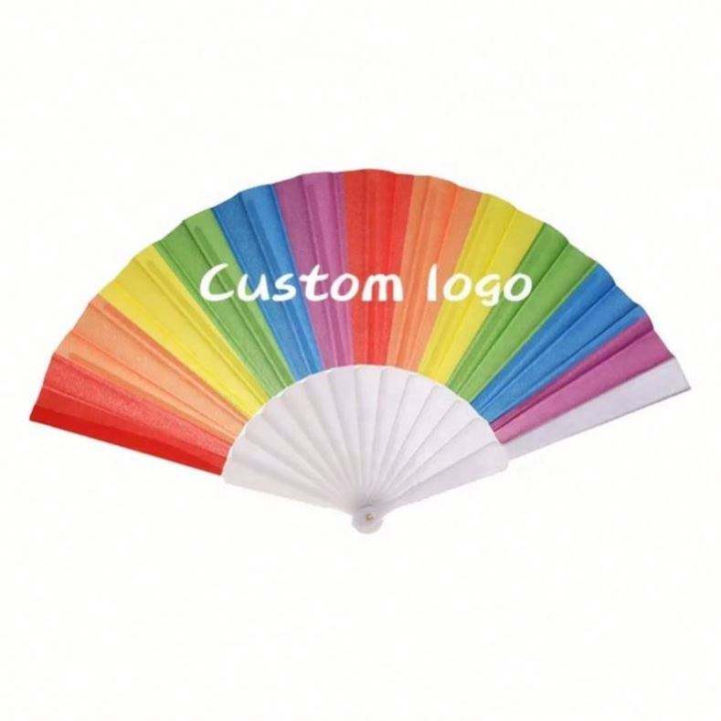 Stock Custom Logo Rainbow Plastic Rib Fabric Folding Hand Fan Gay Pride Folded Fan for Decoration Plastic Hand Fan