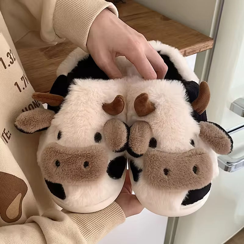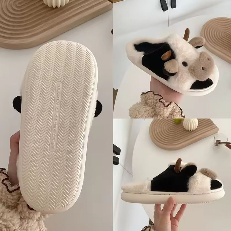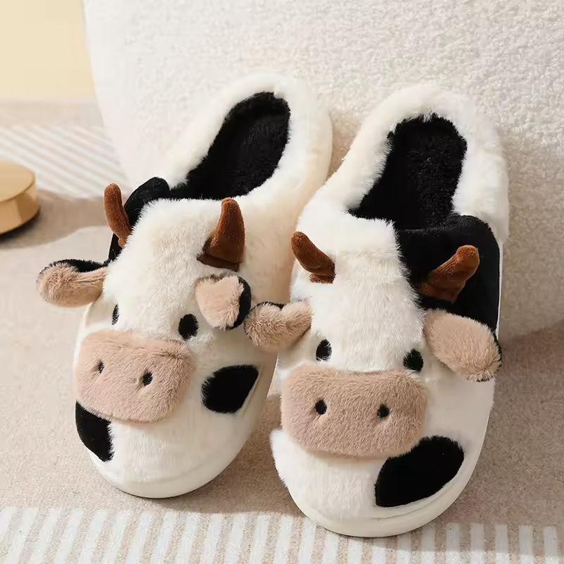 Chaussons d'intérieur tendance à motif vache moelleux, doublure TPR douce, antidérapants, brodés, design plat, pour l'hiver