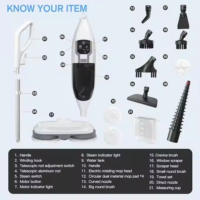 Balai à vapeur 10 en 1 haute efficacité en stock Laveur de sol à vapeur avec balais rotatifs pour usage domestique