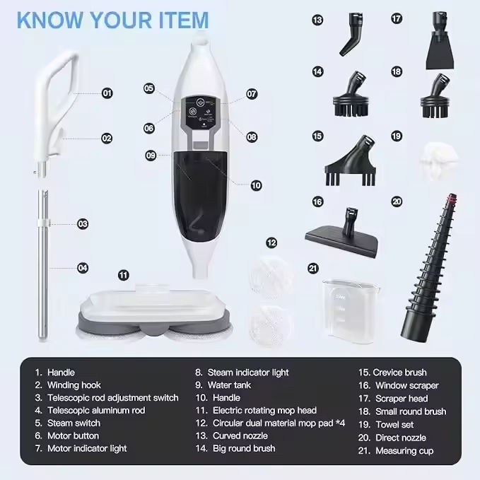Nettoyeur vapeur haute efficacité 10 en 1 avec serpillères rotatives pour usage domestique