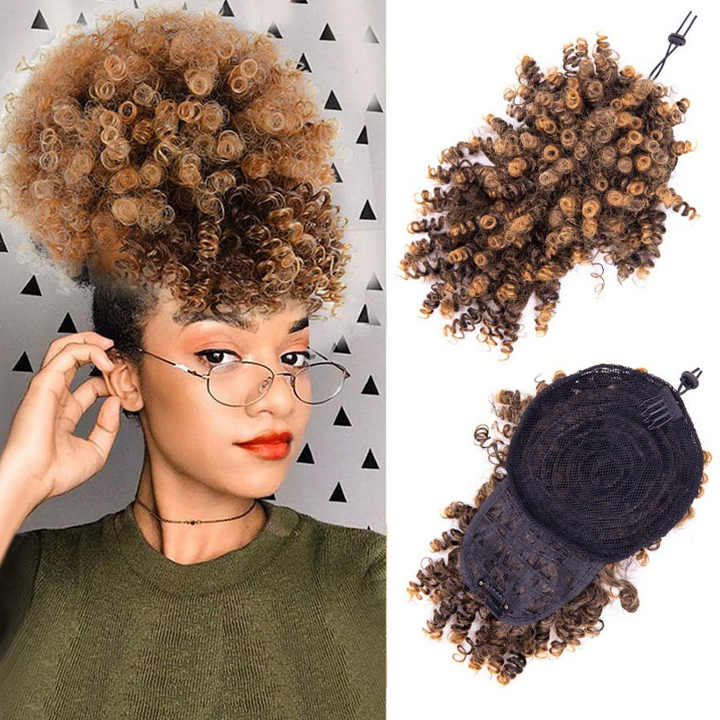 Stock Women Puff Hair Bun With Bangs Short Afro Kinky Curly Pineapple Updo Hair Extensions Drawstring Ponytail with Bangs Clip