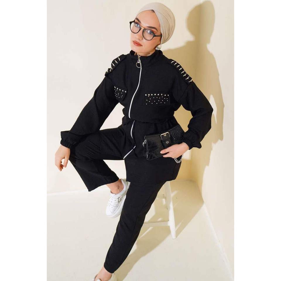 Ensemble de 2 pièces en lin zippé orné de pierres, noir