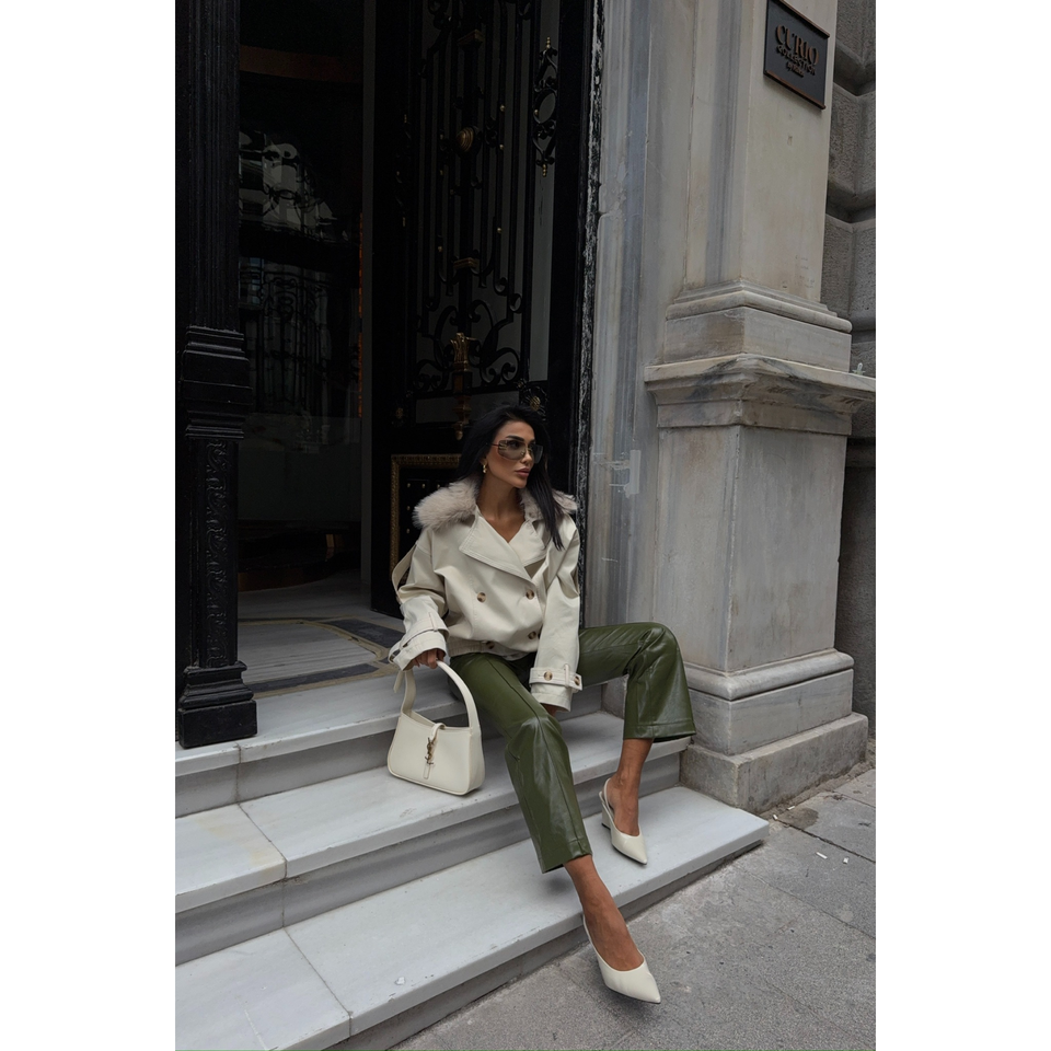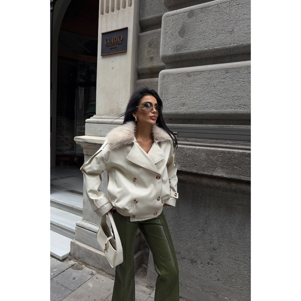 Manteau court en trench-coat avec col en fourrure pour femme, taille S