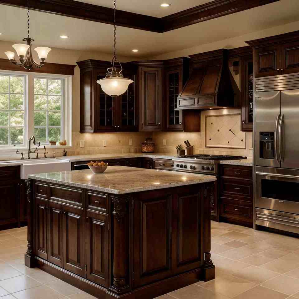 Comptoir en dalle de pierre, armoires de cuisine en bois foncé, style moderne du milieu du siècle, conception intégrée d'appareils cachés, armoires de cuisine