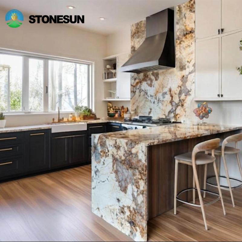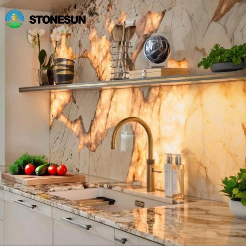 Comptoirs de cuisine en quartzite naturel translucide Pandora StoneSun Lighting pour salon, mur de la maison, îlot, table, dessus de meuble-lavabo