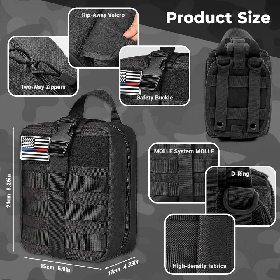 Kit de premiers secours pour traumatismes, avec patchs pré-emballés compatibles MOLLE et personnalisables, comprenant des seals thoraciques et des bandages israéliens, pour l'arrêt des saignements