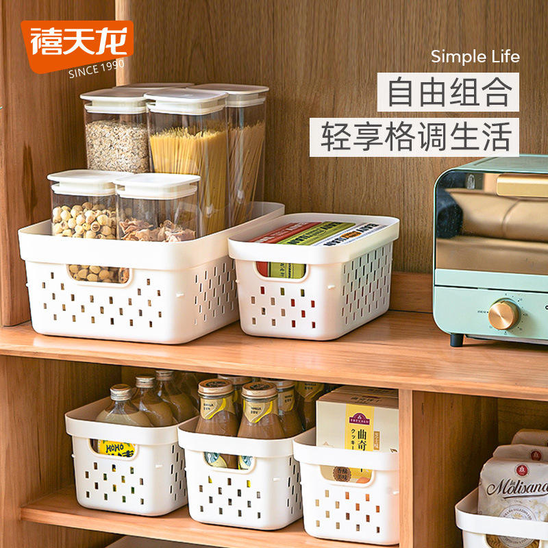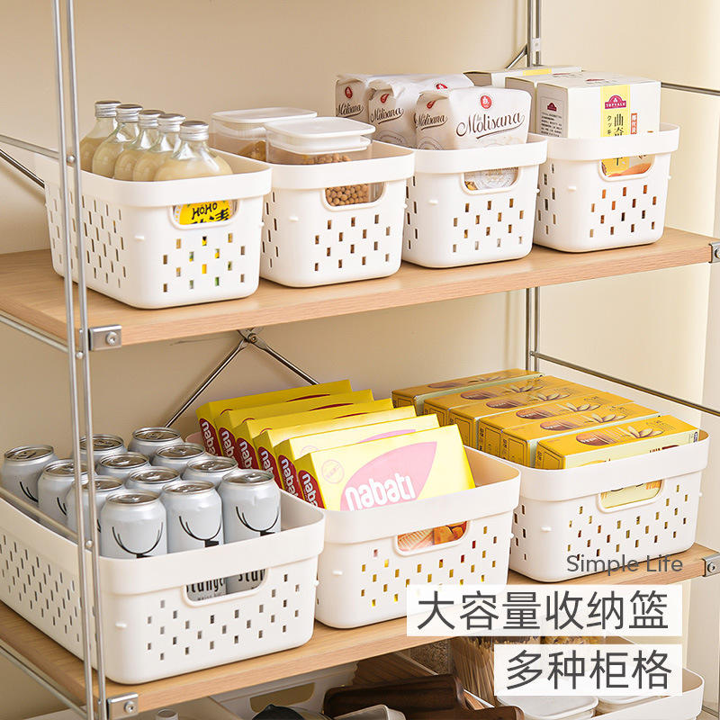 Paniers de rangement rectangulaires blanc cassé avec poignée pour cuisine, armoire, bureau, organisation de collations et de fruits