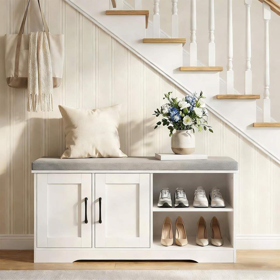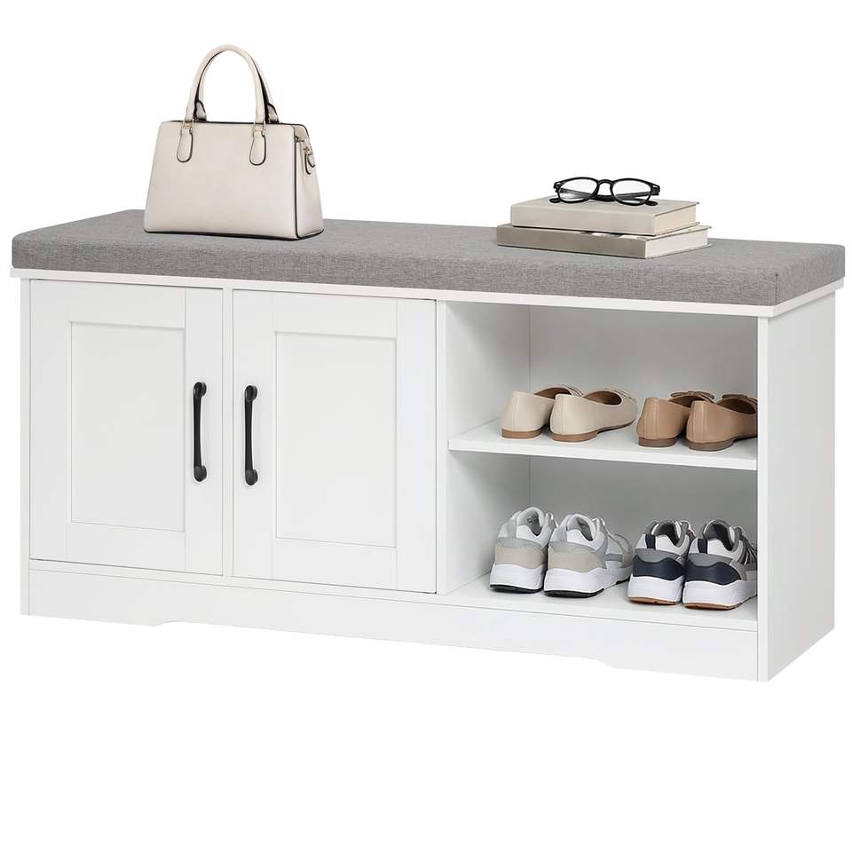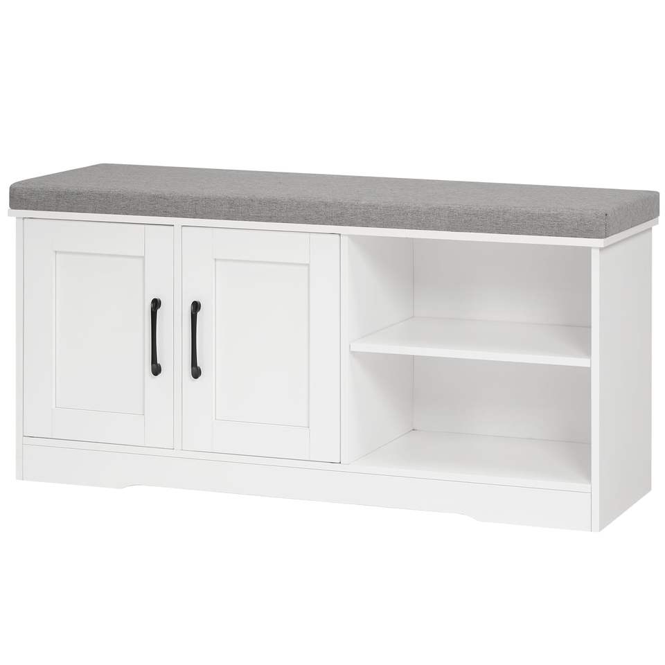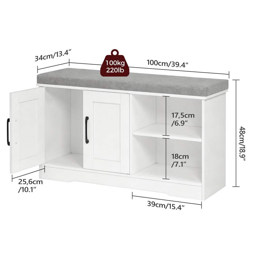 Banc de rangement de 39,4 po de large avec coussin rembourré, banc d'entrée avec 2 portes et étagère réglable, banc de bout de lit