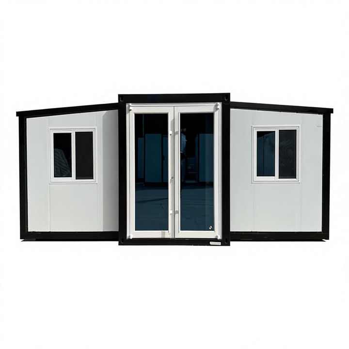 Maison conteneur extensible optimisée pour le rangement, avec armoires intégrées, espace garage, design moderne, construction en panneaux sandwich d'acier, villa