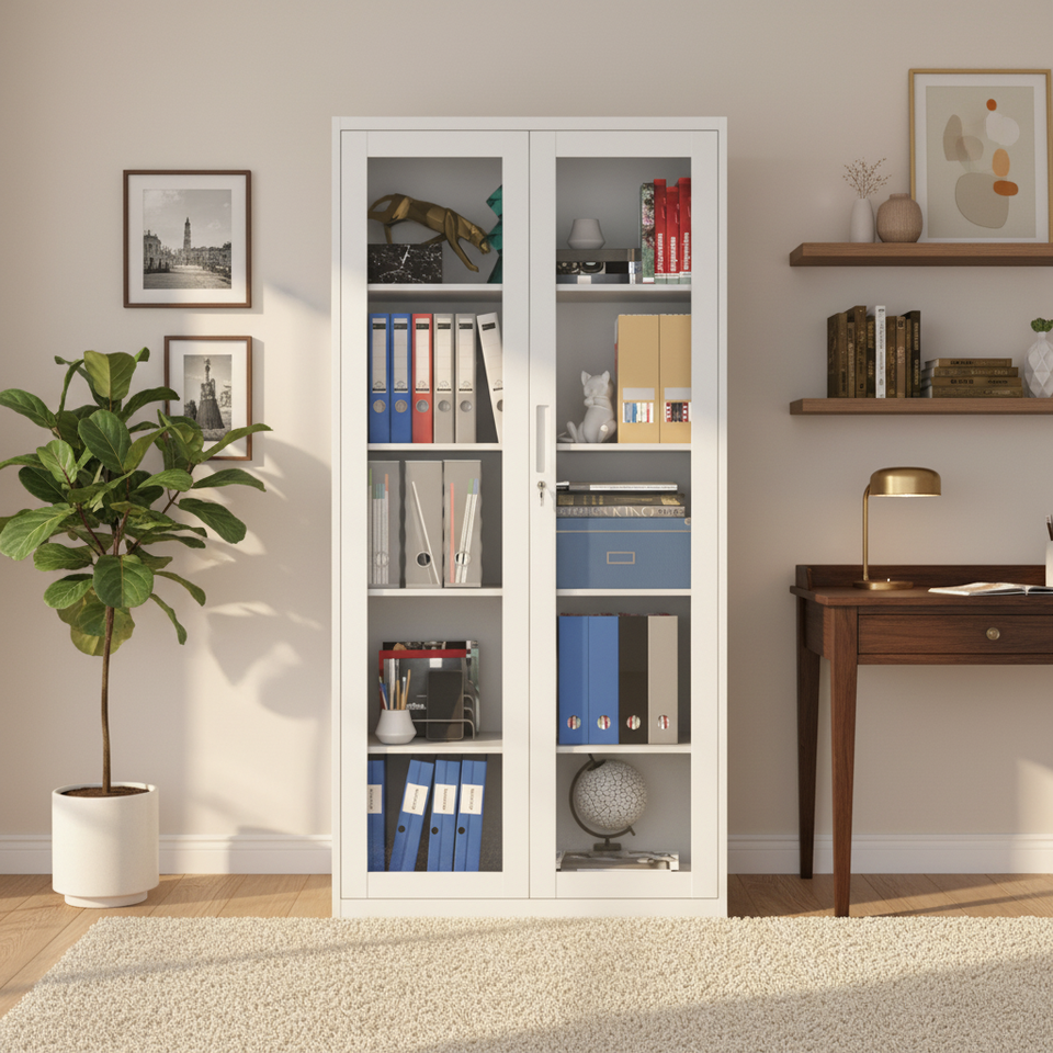 Armoire de rangement en métal à double porte avec serrure en verre, sécurisée, pour le rangement de dossiers de bureau, en acier durable, organisée