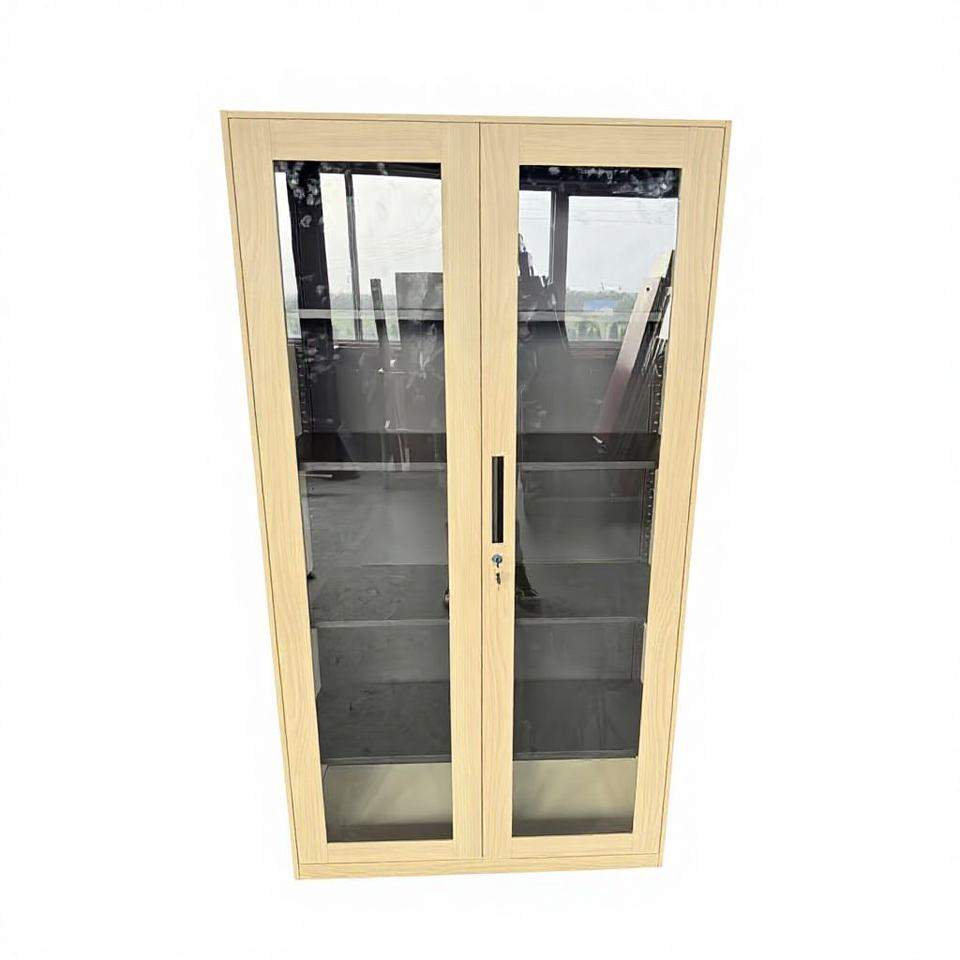 Armoire de rangement en verre transparent avec impression de grain de bois métallique, accès facile et sécurisé, pour le bureau