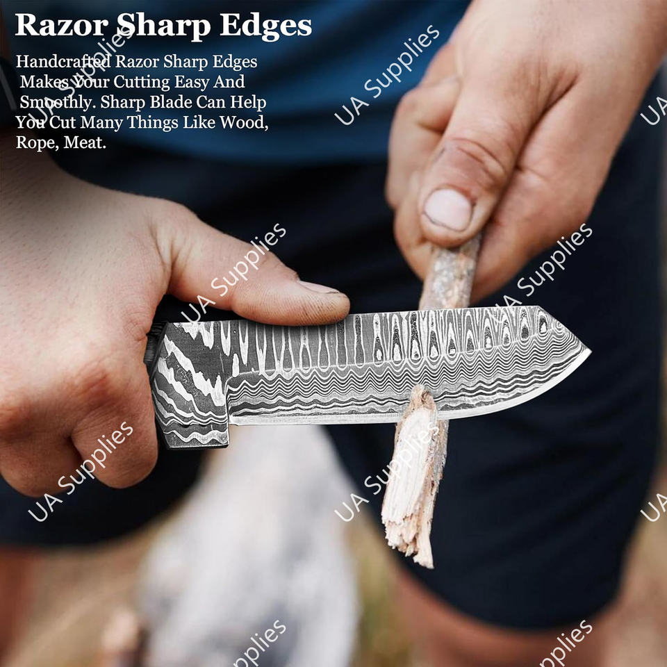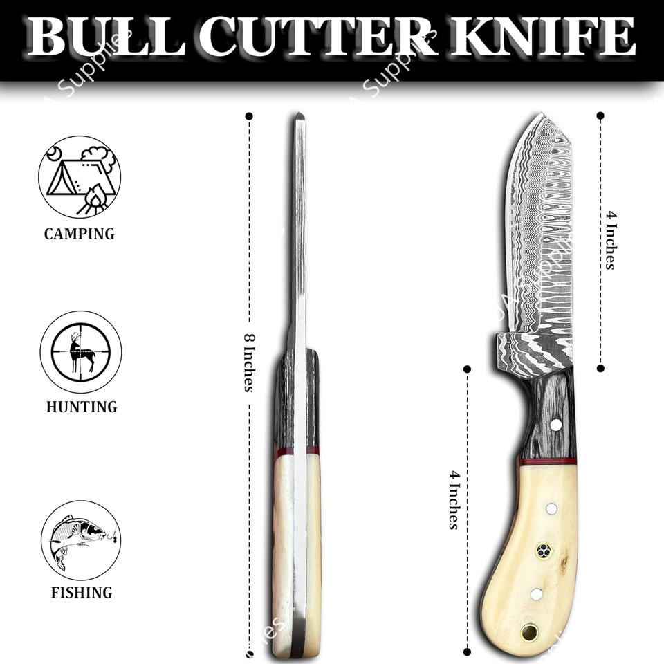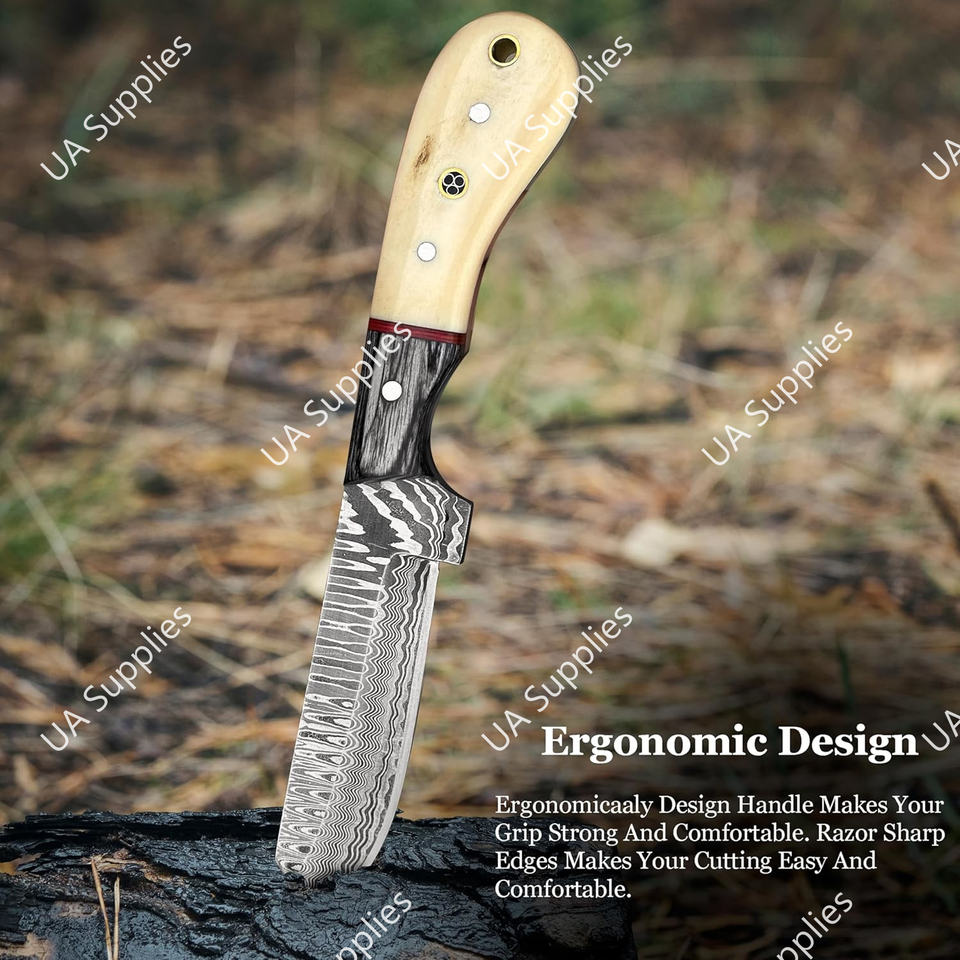 Couteau de chasse et de cowboy occidental en acier Damas à lame droite, manche en os de chameau et bois, motif échelle, pour le camping, OEM, faibles MOQ