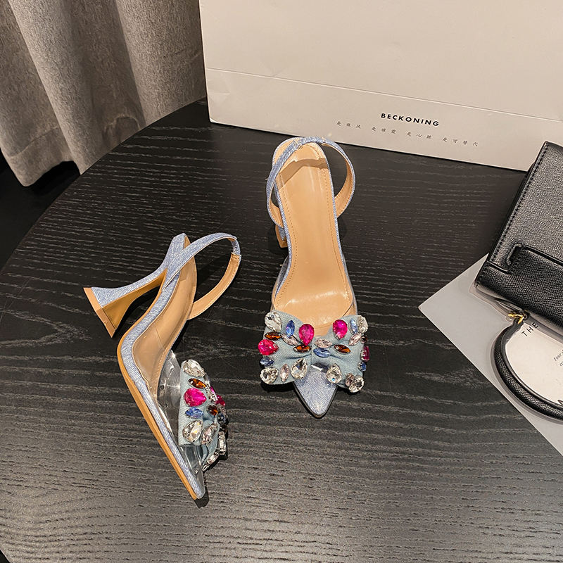 Mules à talons hauts bleues style original, sandales d'été tendance avec nœud en jean et cristaux, escarpins de soirée à bout pointu pour femmes