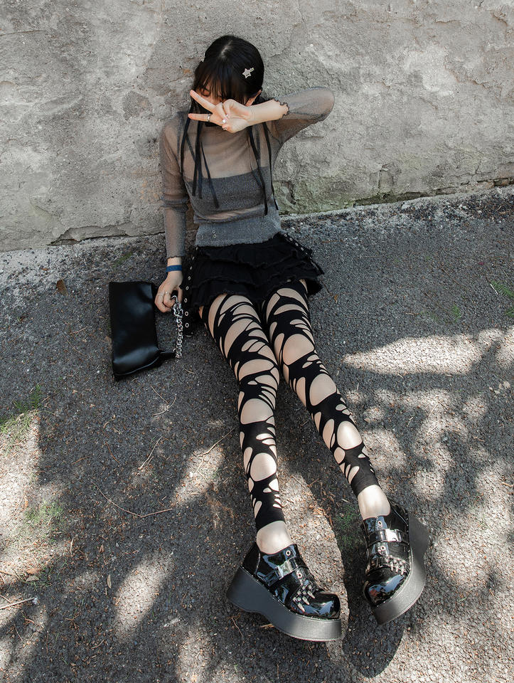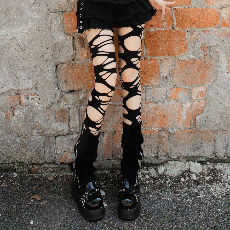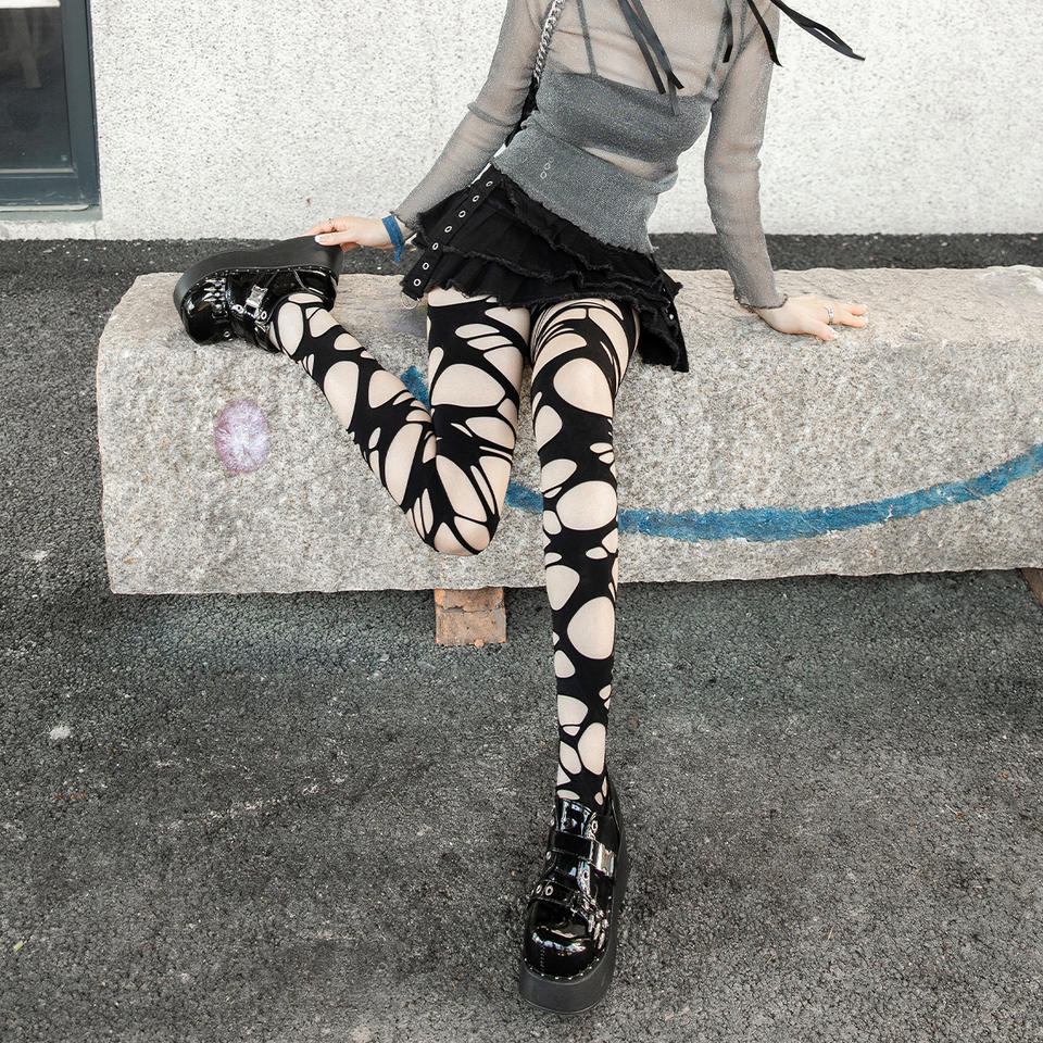 Collants à bretelles sexy déchirés irréguliers Sex Spice ajourés pieds femmes résille noir