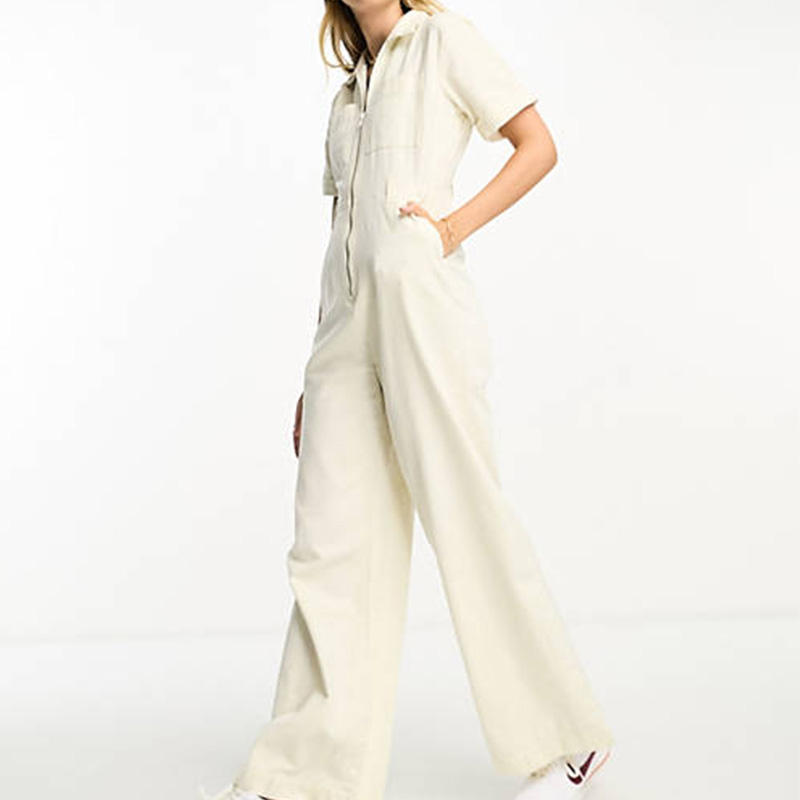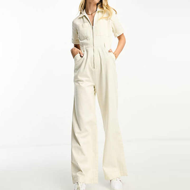 Combinaison formelle de style de rue pour femmes Col ouvert Poches à fermeture éclair sur le devant Combinaison pour femmes à col sergé et jambe large