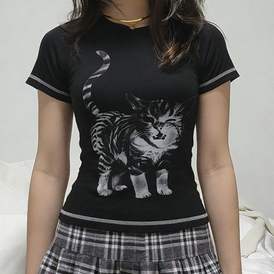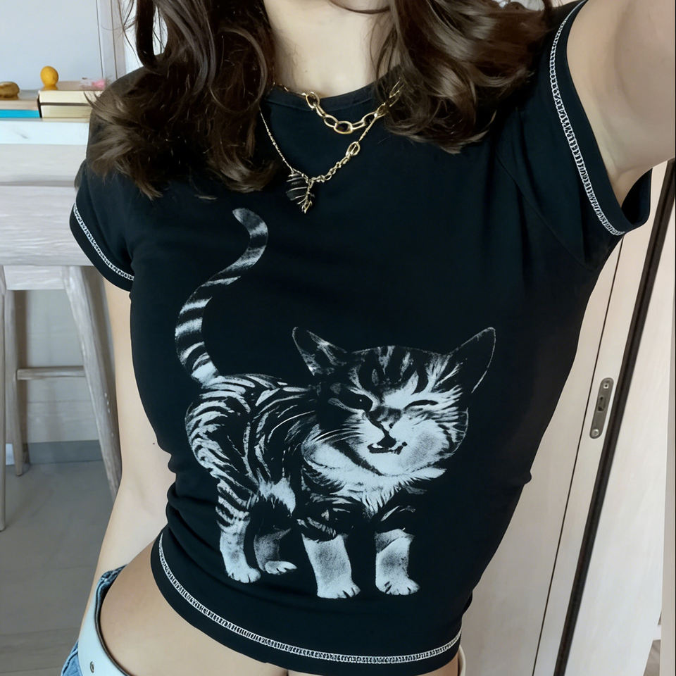 T-shirt à manches courtes style rétro Y2K, imprimé chat, épaules droites, couleur contrastée, tendance, sexy, pour fille branchée