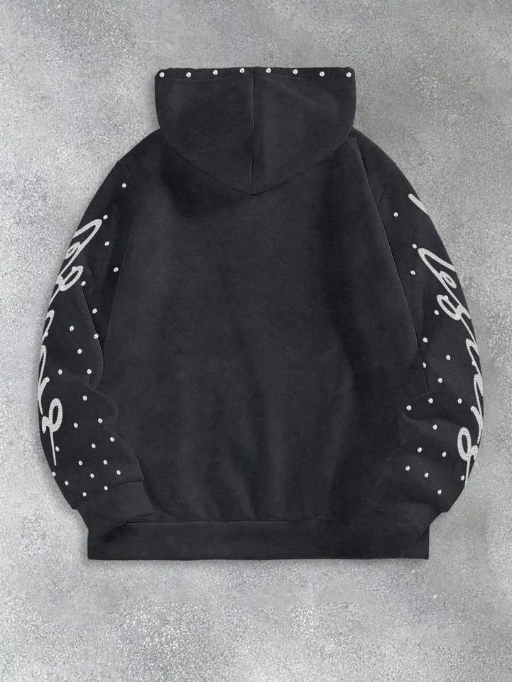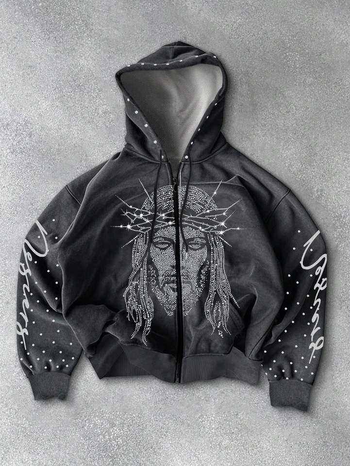Streetrush Sweat à capuche unisexe zippé sur le devant avec cordon de serrage, broderie en strass, appliqué, imprimé figuratif, design Y2K style High Street