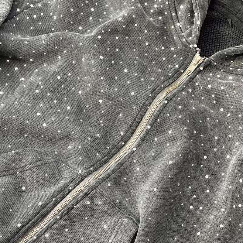 Sweat à capuche zippé streetwear personnalisé coupe ample courte, effet délavé au soleil, 480 g/m² épais, orné de strass, service OEM pour hommes