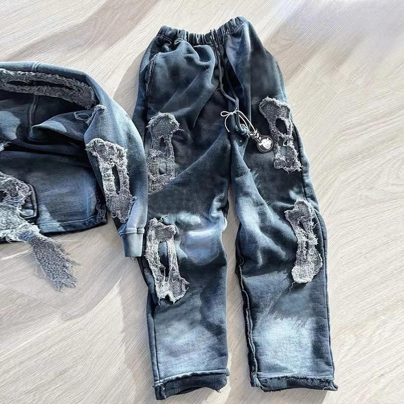 Streetwear Custom Vintage Embroidery Distressed Patch Logo Acid Wash Hoodie Jogger Pants 2 Piece Sets Mens Tracksuit