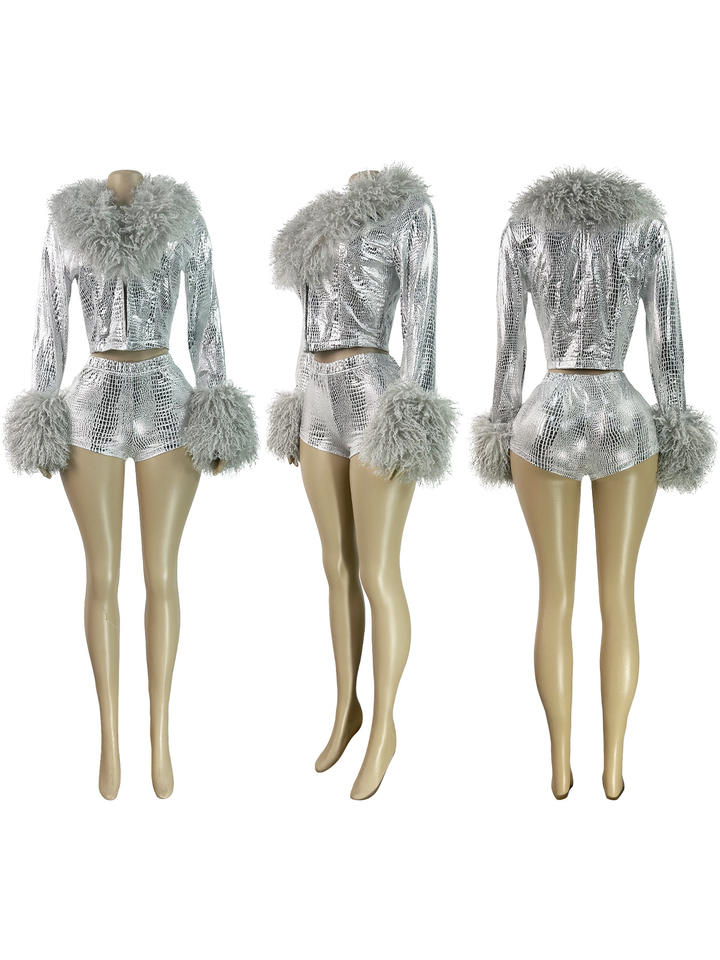 Ensemble deux pièces sexy pour femme : veste courte en fourrure patchwork et short de motard – Collection automne-printemps streetwear