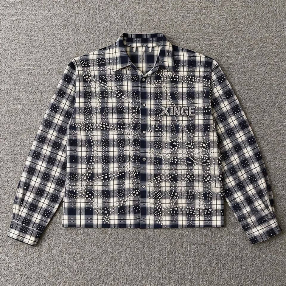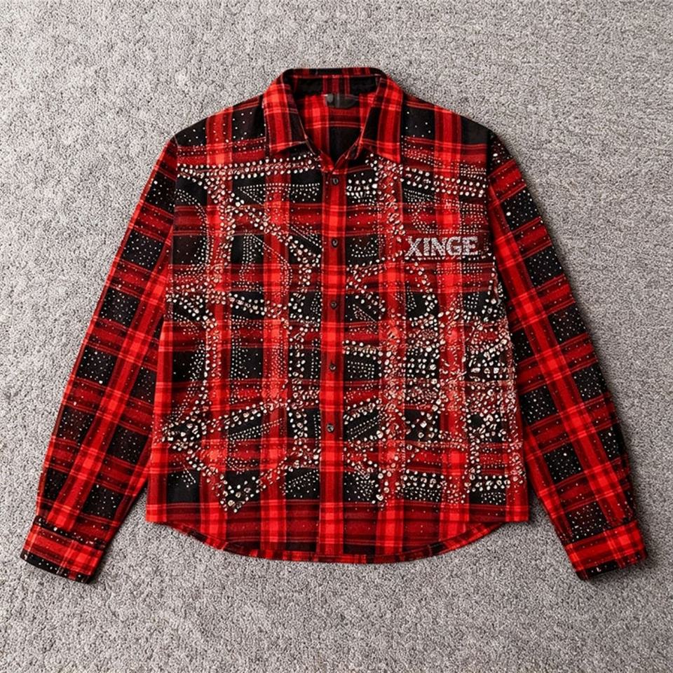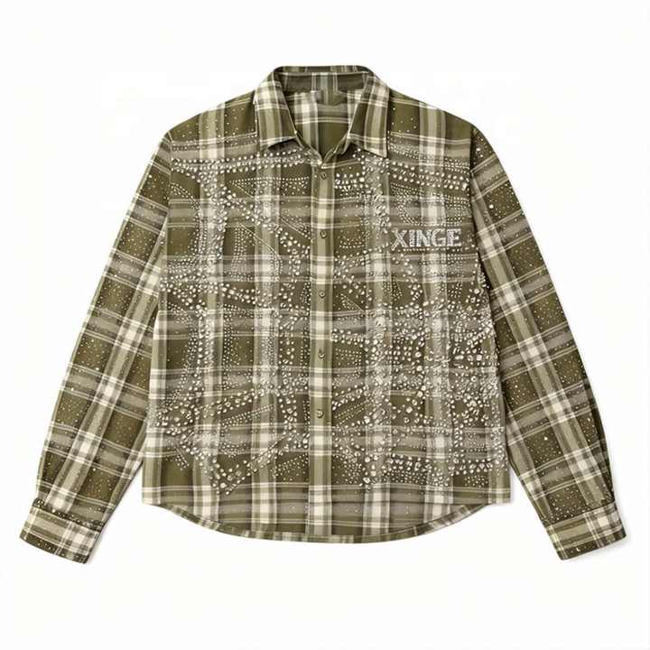 Chemise Homme Streetwear Multicolore à Col Boutonné Coupe Droite Légère en Flanelle à Motif Strass et Carreaux