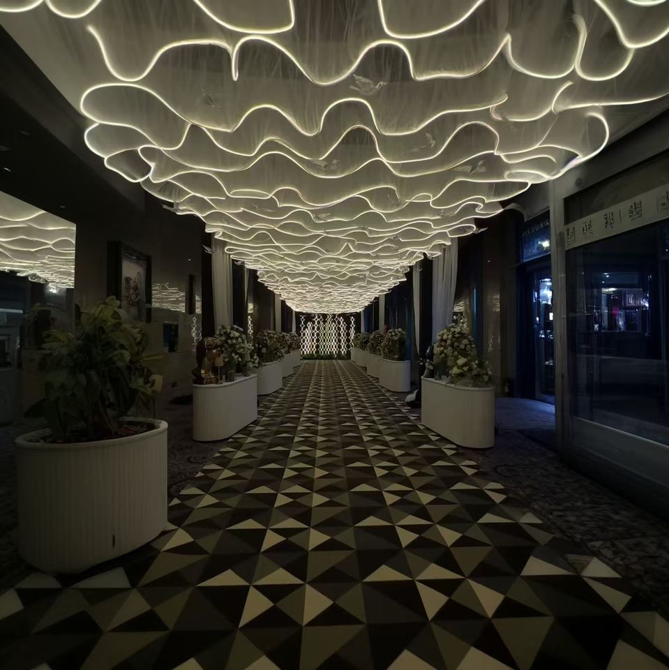 Rideau à Fils Voile Drapé Mural Plafond Toile de Fond Événement Éclairage Décoratif Plafond Rideau Forme Vague pour Mariage