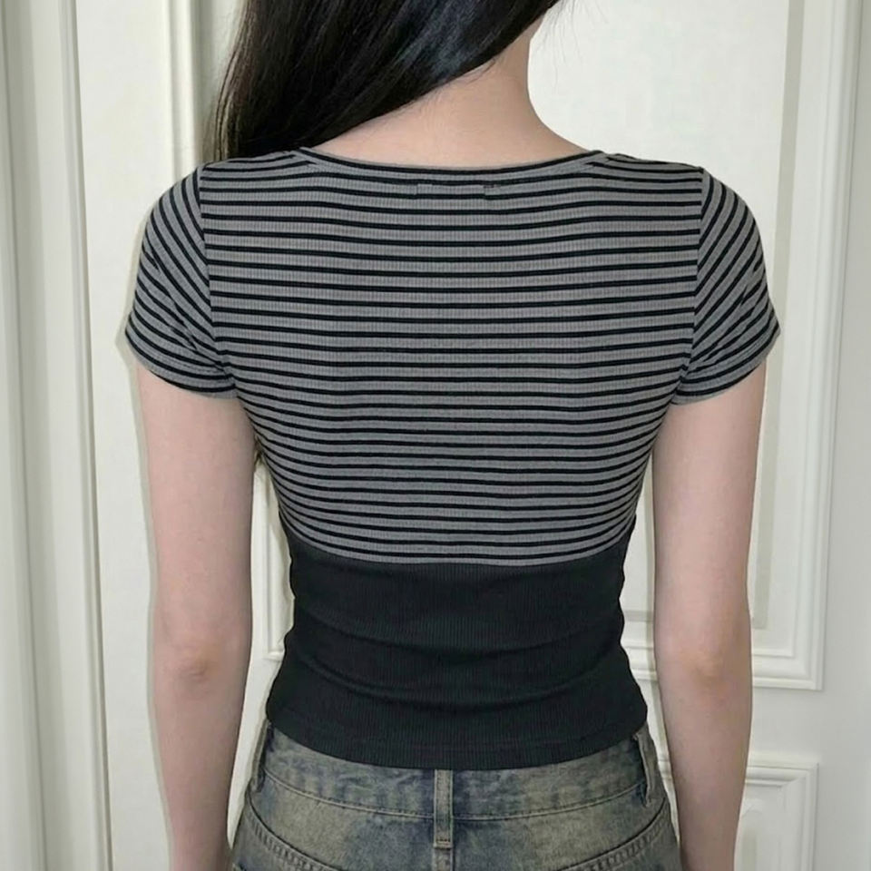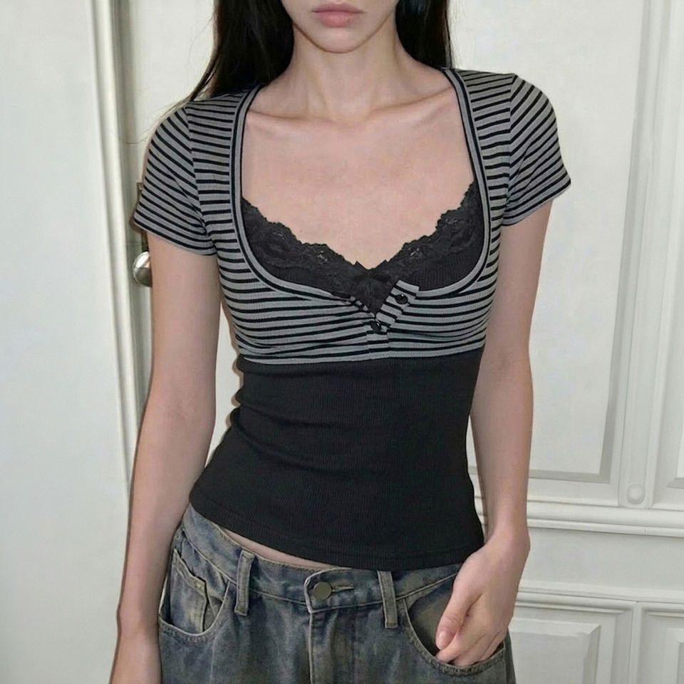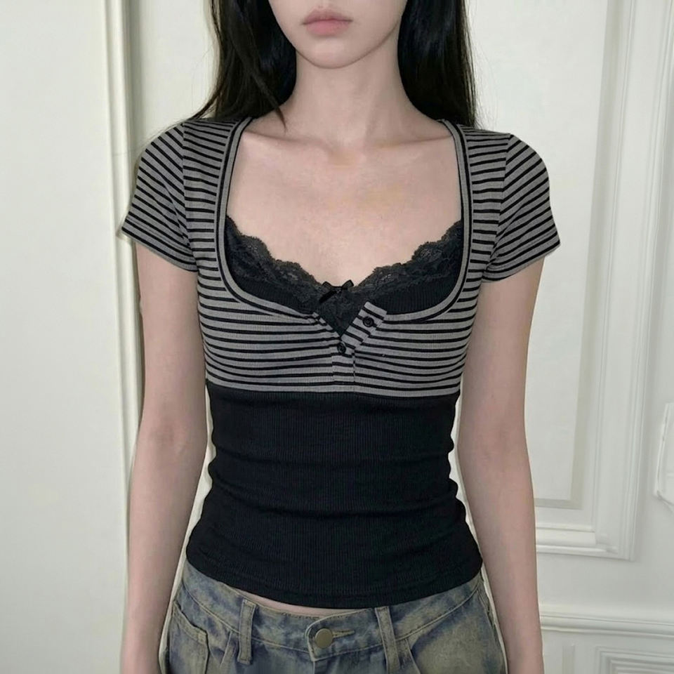 Ensemble deux pièces haut et gilet boutonné à imprimé rayé, avec garniture en dentelle, sans manches, style Y2K, décontracté, rétro, polyvalent, tenue d'été pour femme