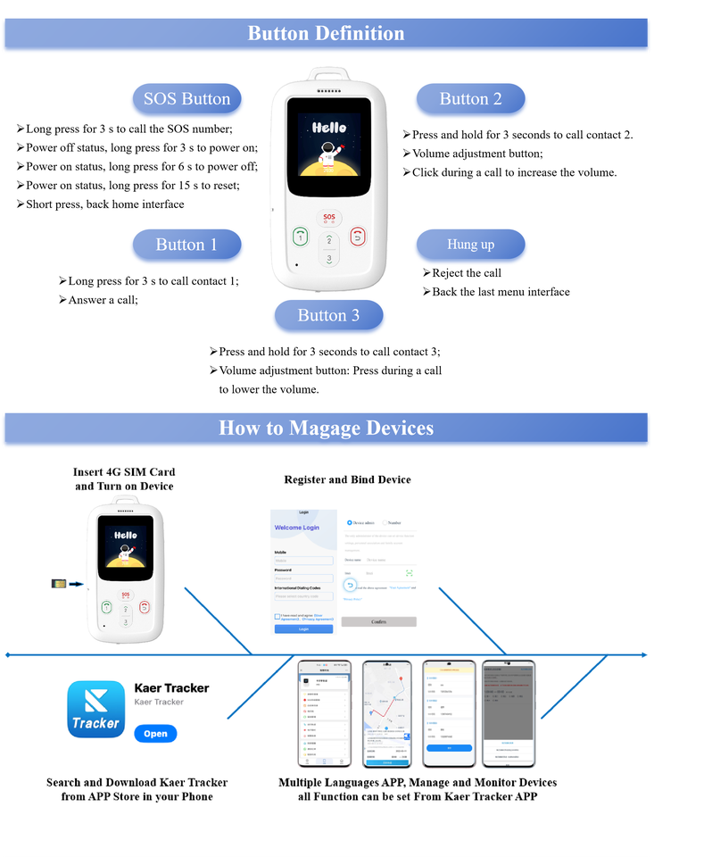 Appel D'urgence SOS, Télécommande, Télécommande app, Emplacement GPS, Mode D'économie d'énergie, Suivi en temps réel, L'historique de localisation, Suivi de l'activité