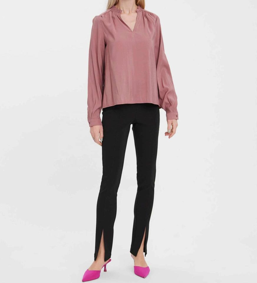 Superbe haut à manches longues avec un col en V flatteur, manches longues bouffantes, volant au col et ourlet incurvé