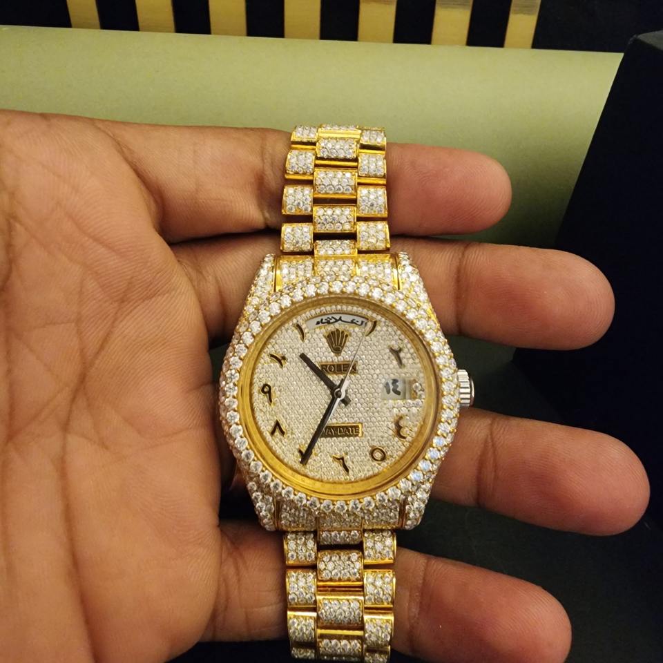 Superbe montre ronde fantaisie à deux chiffres arabes entièrement glacée avec mouvement suisse en moissanite et diamant