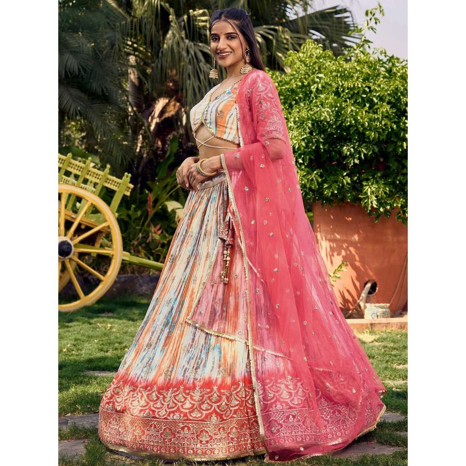 Stunning White & Pink Digital Printed Chinon Festive Wear Lehenga Choli for Cocktail Dresses